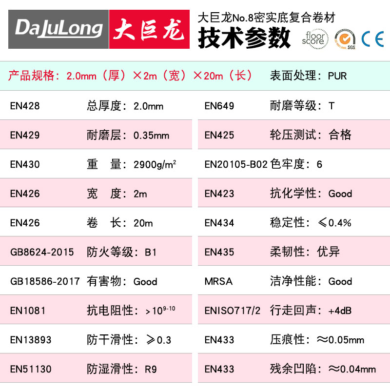 大巨龍NO.8塑膠地板規格參數:20m×2m×2.0mm 耐磨層:0.35mm 重量:2900克/平米 防火等級B1