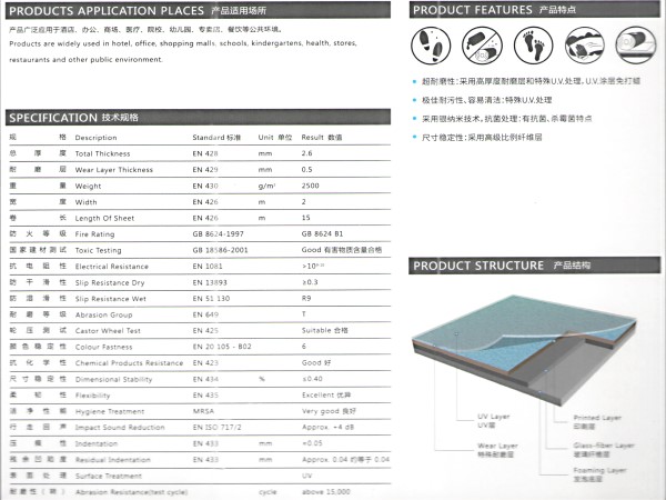 產品性能:高厚度純PVC耐磨層,耐磨耐用,使用壽命長,高回彈泡沫背襯層回彈力優異,高密度玻璃纖維穩定層可避免熱膨脹和冷收縮。特殊表面UV處理工藝易于清洗,無需蠟處理,色彩可塑性很強。不含任何重金屬材料,不含甲醛,不輻射對人體健康不會造成任何危害,非常環保。