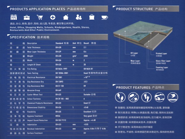 產(chǎn)品性能:高厚度純PVC耐磨層,耐磨耐用,使用壽命長,高回彈泡沫背襯層回彈力優(yōu)異,高密度玻璃纖維穩(wěn)定層可避免熱膨脹和冷收縮。特殊表面UV處理工藝易于清洗,無需蠟處理,色彩可塑性很強。不含任何重金屬材料,不含甲醛,不輻射對人體健康不會造成任何危害,非常環(huán)保。