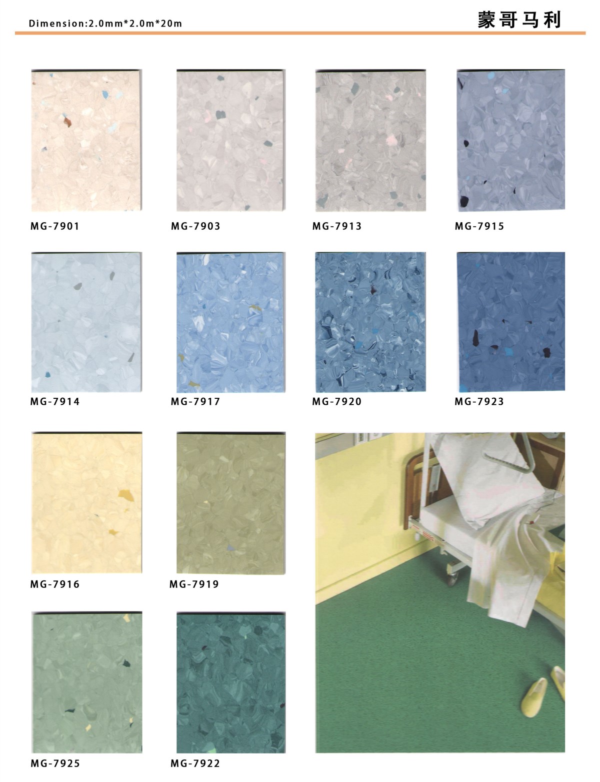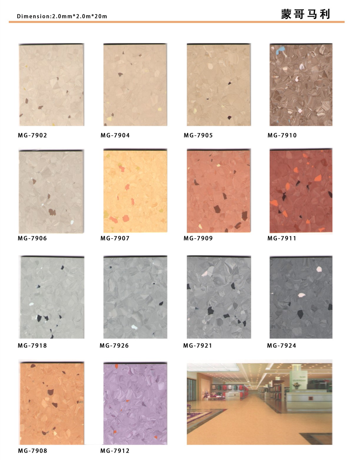 凱立龍蒙哥馬利地板系列 是一種經過加壓處理的同質透心卷材地板,無方向性設計,其彩色碎片與天然混合物經 過特別處理后均勻的分布在地板內,加上其色彩豐富,適合多方面的設計。 其表面層經過加壓 加密度處 理后達到提高耐磨和容易保養的效果。該產品經過耐碘酒UV特殊維護處理,具有良好的抗化學性能及 耐污染性,表面致密耐刮擦,清潔保養便捷,養護成本低廉。鋪裝后無需打蠟!