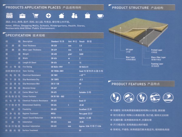 產(chǎn)品特點(diǎn): 環(huán)保,無(wú)甲醛,TOVC排量極低,對(duì)室內(nèi)空氣質(zhì)量有良好的作用。防滑,防滑濕滑性能達(dá)到R9,有效的降低滑倒,防滑性能良好。腳感舒適,使用高彈性發(fā)泡低背,行走舒適。耐磨性能良好,表面采用0.7mm厚度純pvc透明耐磨層,耐磨性能達(dá)到T級(jí),使用壽命長(zhǎng)。