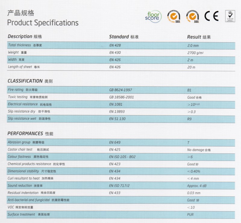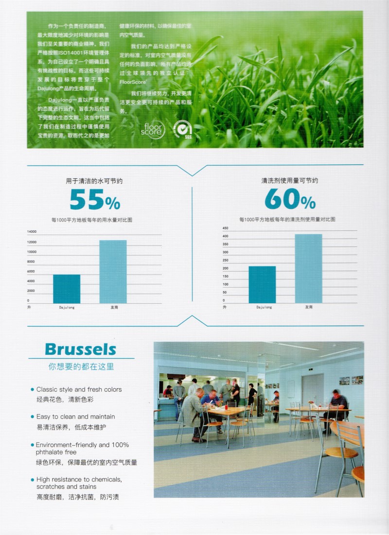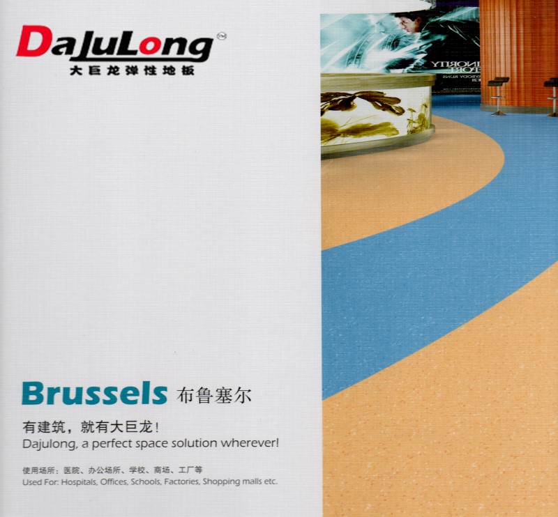 Product features: Da Julong Brussels homogeneous transparent floor with very low TOVC emission, no formaldehyde, anti-bacterial and anti-mildew, is a very environmentally friendly decorative material. The floor meets the requirements of EN469 {34-43} item, and its wear resistance meets the T standard. The product has renovation function, the texture remains unchanged after polishing and polishing, and is suitable for large flow of people. Local use.