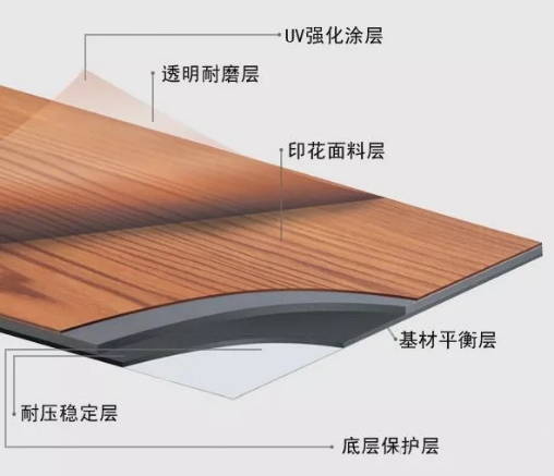 一種是同質透心的,就是從底到面的花紋材質都是一樣的;一種是半同質透心的,就是在同質透芯材料表面加入一層耐磨層;還有一種是多層復合的,它是由多層結構疊壓而成的,一般上面一層是純PVC透明層,下面加上印花層和背層。